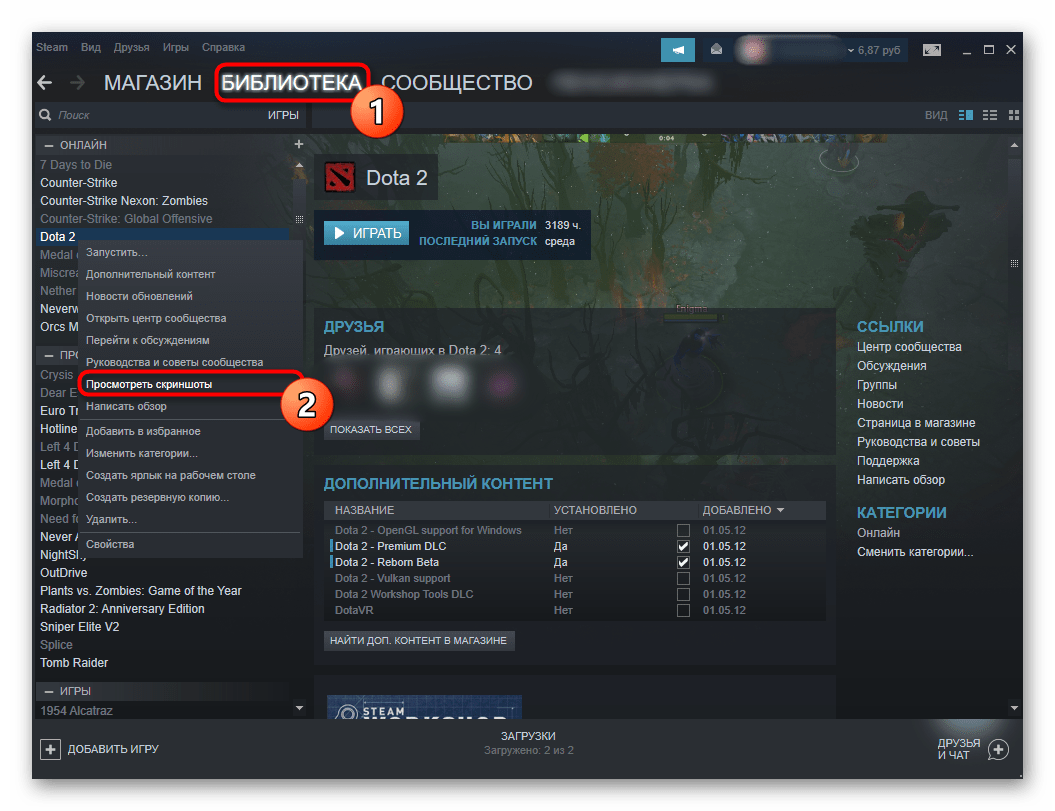 Простой способ узнать, где найти скриншоты Стим – это воспользоваться самой программой. Благодаря этому способу не нужно определять, в какой системной папке расположены файлы. Итак, где в Стиме найти скрины и что для этого нужно сделать: