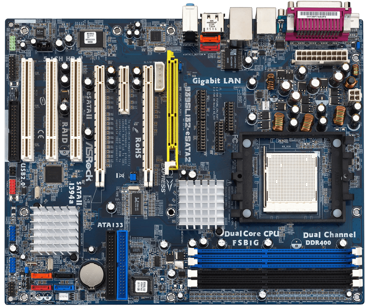 На фото выше – старенькая материнская плата ASRock 939SLI32, где отчетливо видны микросхемы NB и SB – они обе прячутся под одинаковыми алюминиевыми радиаторами, но Северный мост находится ближе к процессору, почти в середине платы. Пройдёт ещё пару лет после выхода этой платы, и производители откажутся от Северного моста – Intel и AMD выпустят процессоры с интегрированным NB.