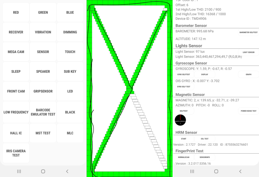 - Отчет о телефоне (Phone Report) – базовый набор последовательных тестов микрофона, динамиков, тыловой и фронтальной камер, приемника, вибромотора, акселерометра, гороскопа, датчиков приближения и освещенности, компаса, сенсорного экрана, кнопок навигации («Домой», «Назад», «Последние приложения») и фонарика (вспышки).