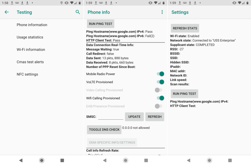 Появится тестовый экран с информацией о телефоне и Wi-Fi, а также несколькими тестами. Под информацией о Wi-Fi нажмите «Пинг» для проверки качества подключения к интернету.