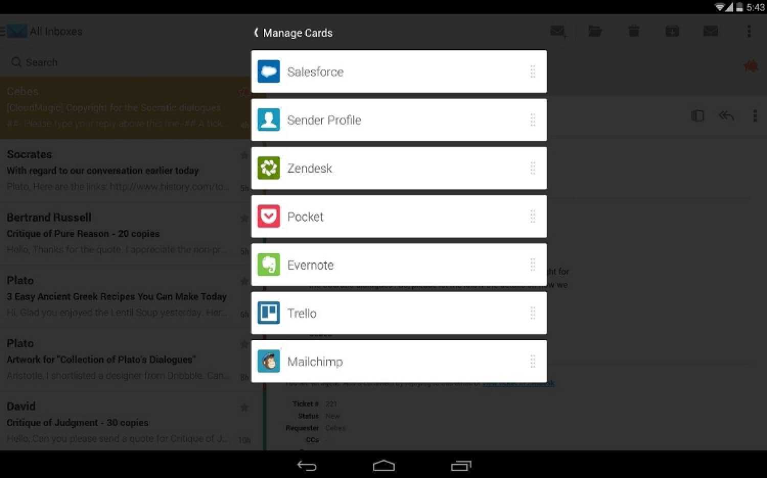 Недавно в CloudMagic появилась картотечная система Cards, позволяющая отравлять электронные письма в Evernote, MailChimp или иные сервисы. Если вы регулярно отправляете сообщения в Evernote или другие поддерживаемые сервисы, эта функция покажется вам весьма мощной.