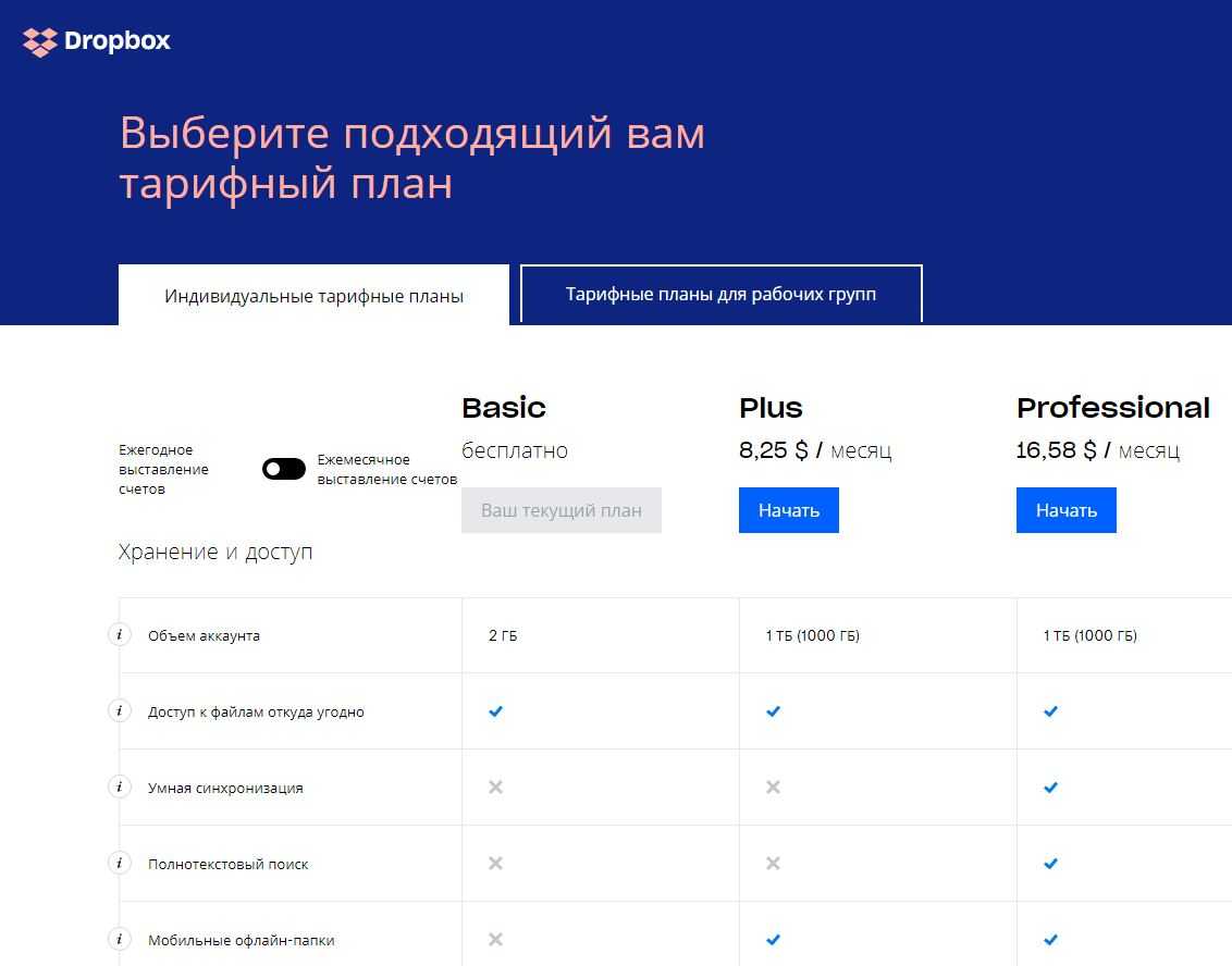 Это облачное хранилище предоставляет 6 тарифов: бесплатную версию, личный, семейный и три бизнес-тарифа. Можно приобрести подписку на месяц либо на год. Стоимость в таблице указана за покупку годового плана.