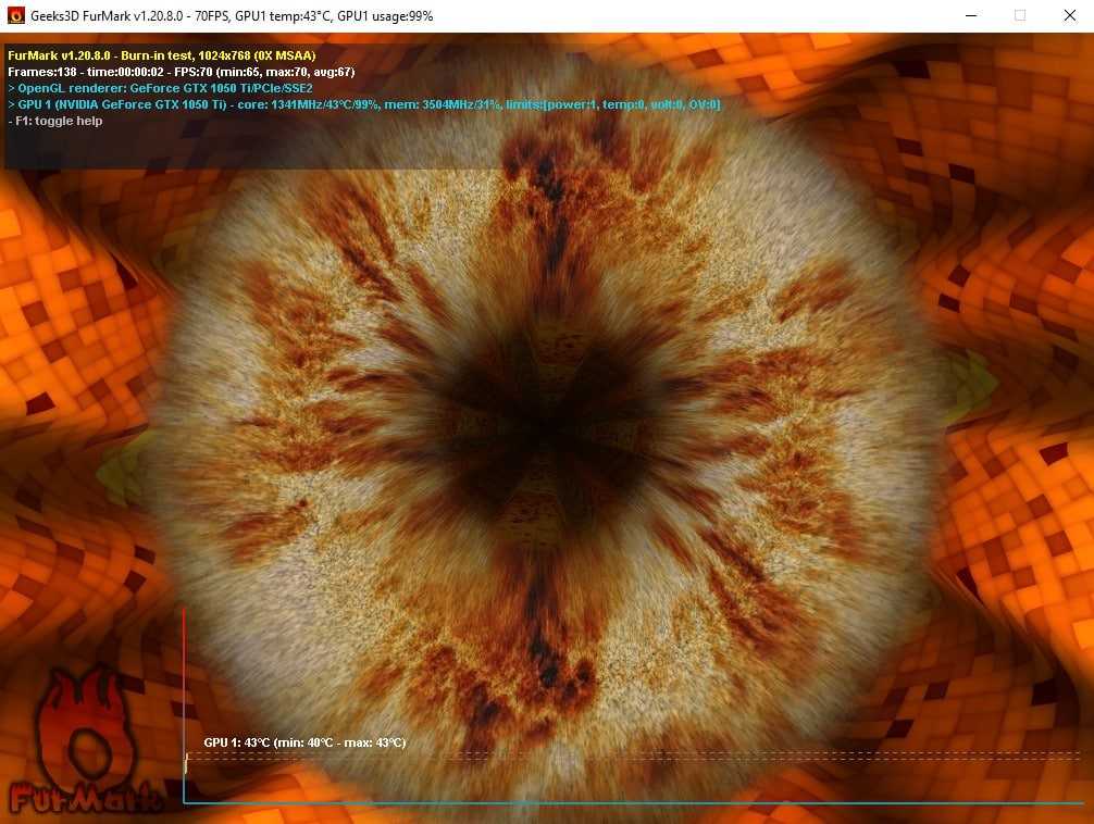 После запуска стрес-теста появится окно с движущимся изображением, а также график температуры видеокарты. Понаблюдайте за работой видеокарты в стрес-тесте. Во время тестирования на экране не должно появляться никаких артефактов, а температура должна подняться до уровня 70-80 градусов Цельсия и остановится на этом уровне.