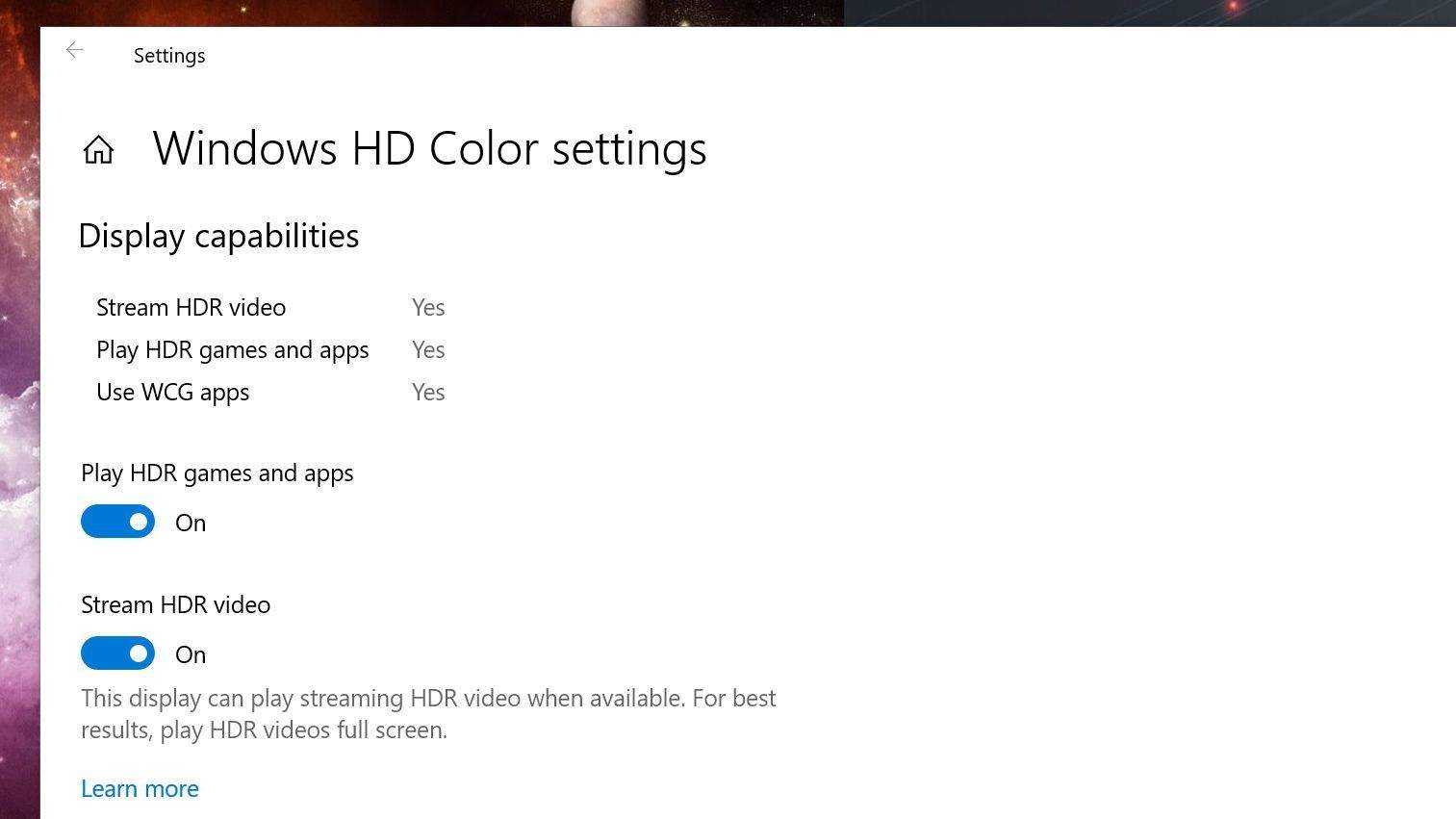 Пришло время настроить некоторые вещи в Windows. Открыть Настройки> Приложения> Воспроизведение видео и щелкните Параметры цвета Windows HD. Если ваш дисплей поддерживает HDR, вы должны увидеть переключатель с надписью «Играть в HDR-игры и приложения» на этой странице — включите его, и вы увидите всплывающий значок HDR в углу экрана.