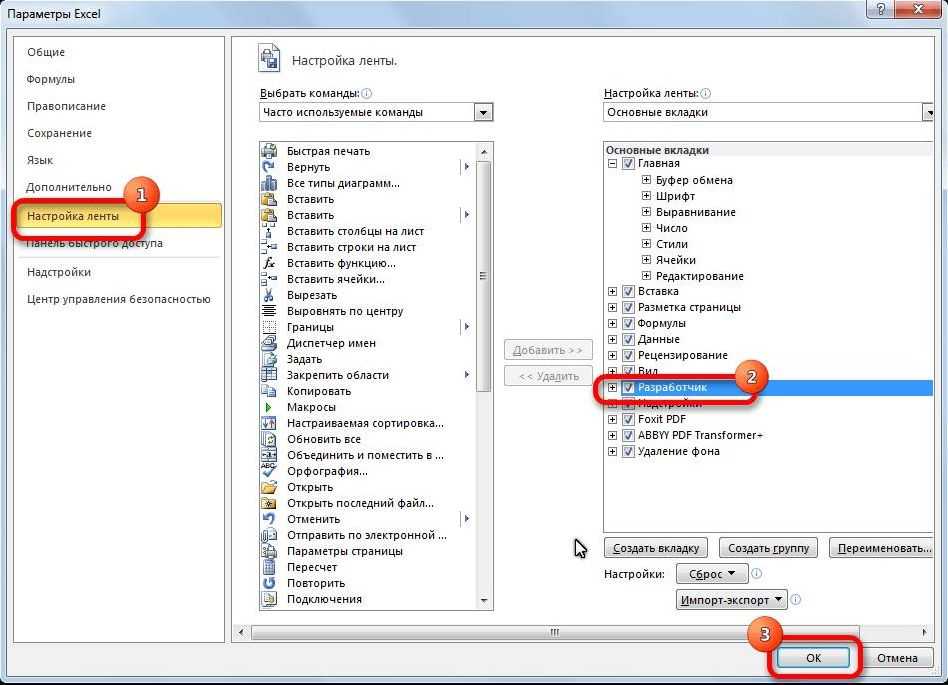 - Находим в появившемся окне пункт слева НАСТРОЙКА ЛЕНТЫ и отмечаем строку «Разработчик» в разделе ОСНОВНЫЕ ВКЛАДКИ. Нажимает ОК.