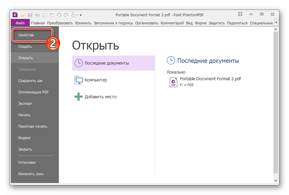 - открыть меню, зайти в раздел «Файл» — «Свойства»;