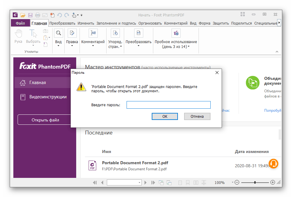 - Откройте защищаемый паролем документ в Фоксит ФантомПДФ.