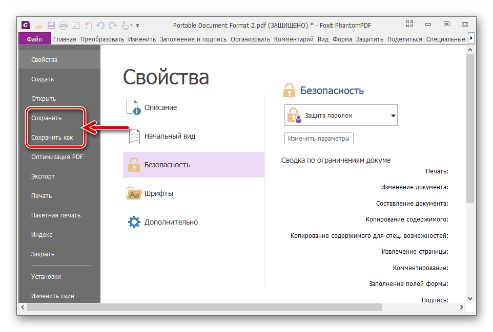 Зафиксируйте произведённые в отношении PDF-документа изменения, выбрав пункт «Сохранить» в меню «Файл» программы PhantomPDF, или сохраните файл в виде отдельной защищённой копии («Сохранить как»).