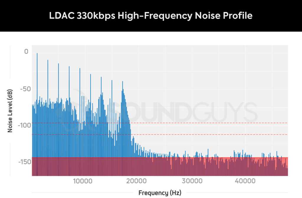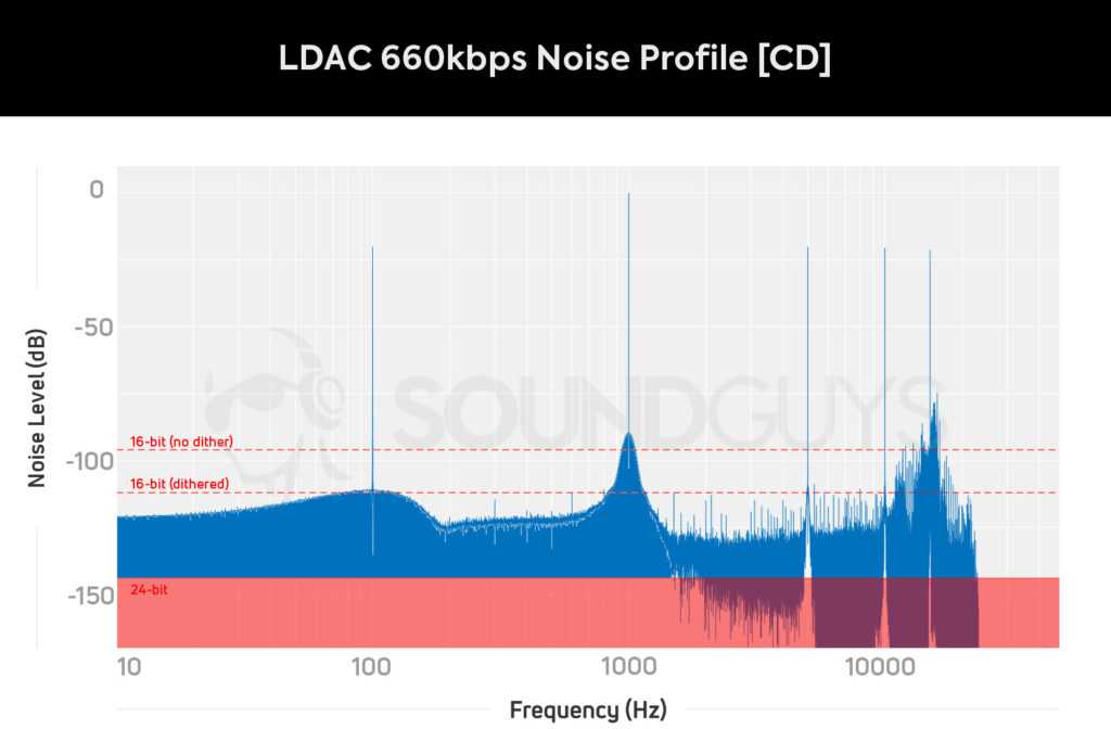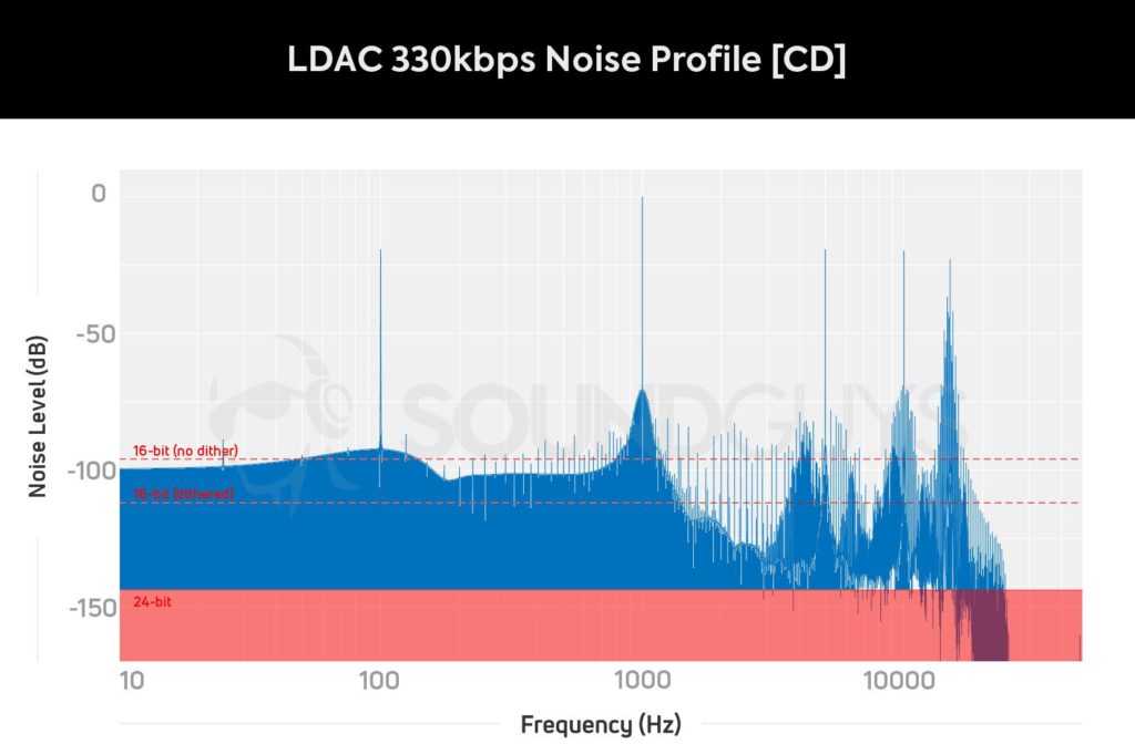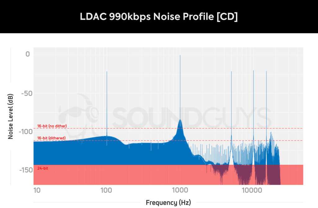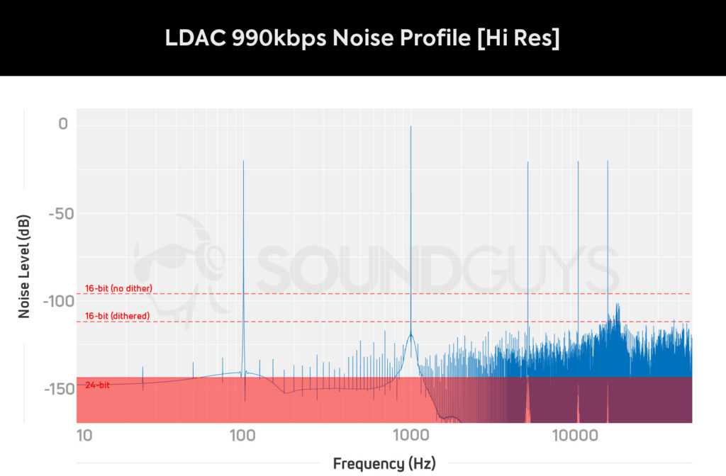 Казалось бы, во время наших тестов мы убедились, что LDAC 990 кб/с обеспечивает передачу звука с частотой около 48 кГц, и должен соответствовать стандарту Hi-Res, однако, он провалил испытание на уровень фонового шума, который был значительно хуже ожидаемого значения соответствующего 24 битам на частотах выше 15 кГц.
