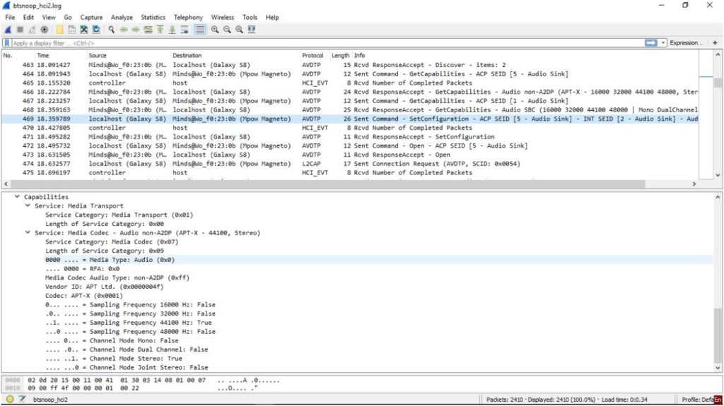 - Этот файл следует открыть с помощью WireShark. Нужно найти записи Audio non-A2DP AptX, Audio SBC – это означает, что устройство поддерживает кодеки AptX и SBC. Команда SetConfiguration — AptX означает, что беспроводная передача звука осуществляется через AptX.