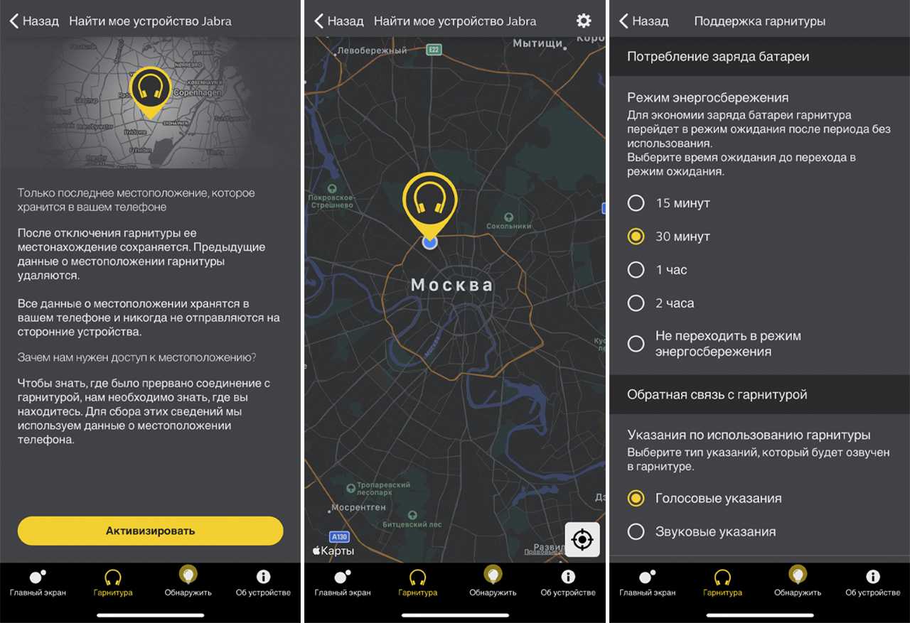 Есть даже режим поиска: можно посмотреть примерную локацию наушников, когда они в последний раз доставались из кейса и были активированы. Также можно активировать громкий писк, чтобы по звуку найти Jabra Elite Active 75t в домашнем бардаке.