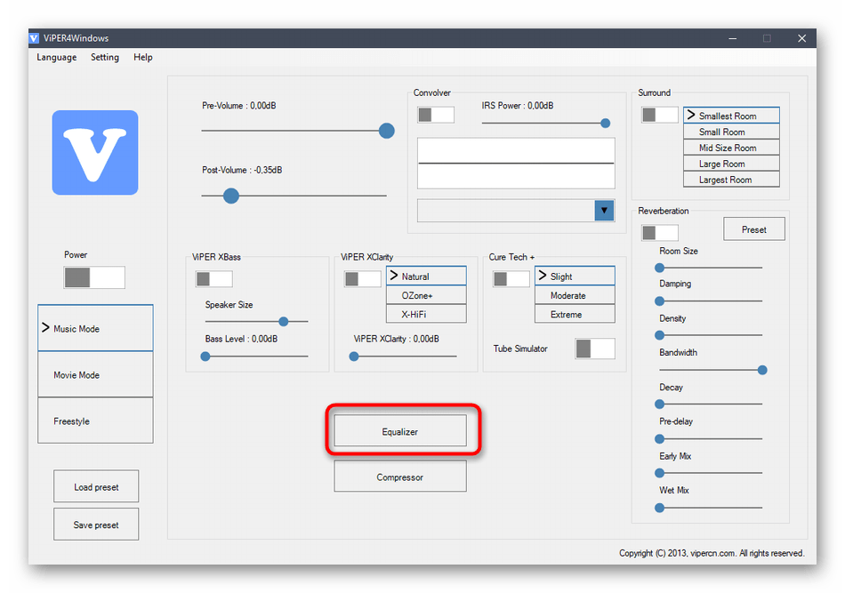 Также профессионалам в мире музыки будет приятно узнать, что Viper4Windows обладает функцией ревербераци, в нем есть компрессор, лимитер и много чего еще.