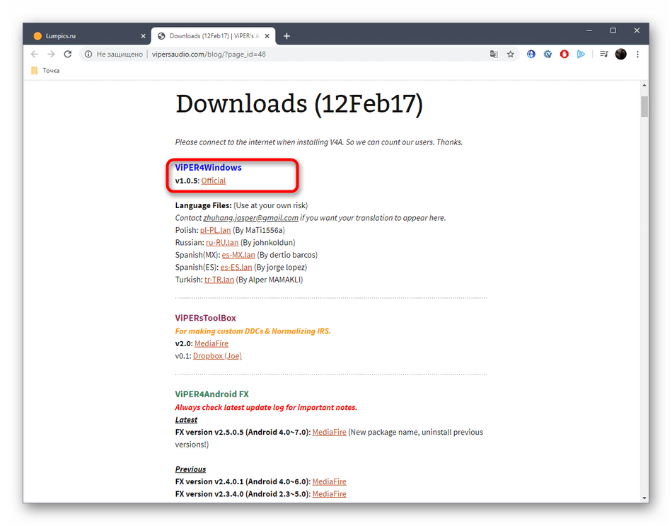 - Любой сторонний софт сначала нужно скачать и инсталлировать. Загрузку лучше производить с официального сайта, чтобы не заразить компьютер вирусами. Что касается ViPER4Windows, то перейти к скачиванию вы можете, кликнув по кнопке-ссылке выше.