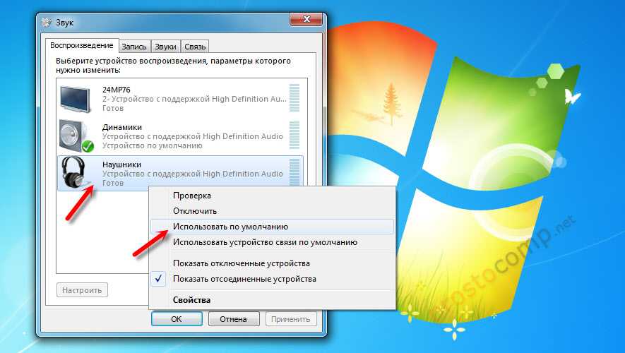 И если там есть наушники, то установите их по умолчанию. Как на скриншоте ниже.