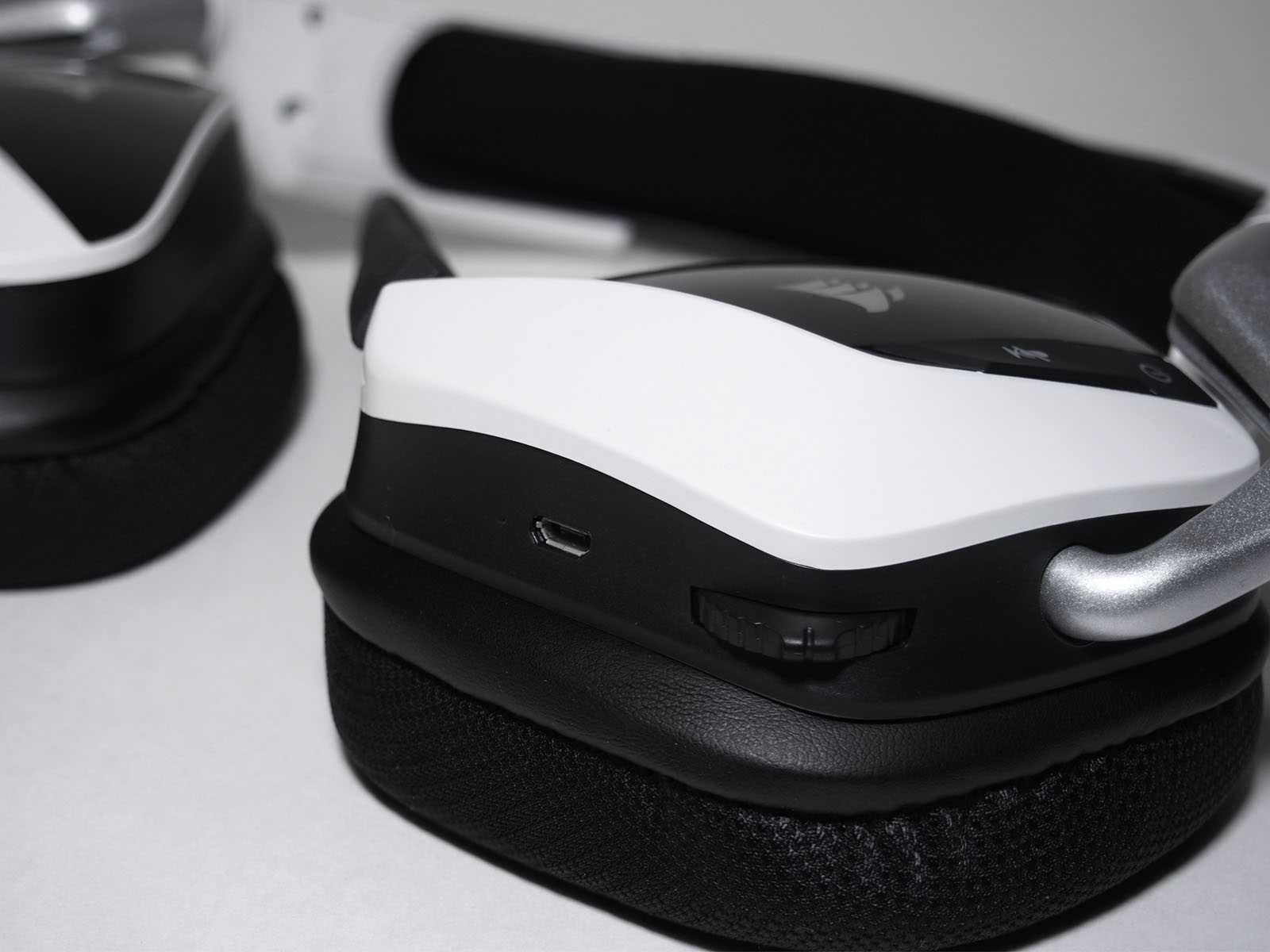 На самой гарнитуре Corsair Virtuoso RGB Wireless совсем немного органов управления: колёсико громкости и переключатель режимов USB-радио-канал. Регулятор громкости поворачивается плавно, неспешно и удобно. Меняется одновременно с системной громкостью, если говорить о Windows. А упомянутый переключатель ещё и выключает наушники.