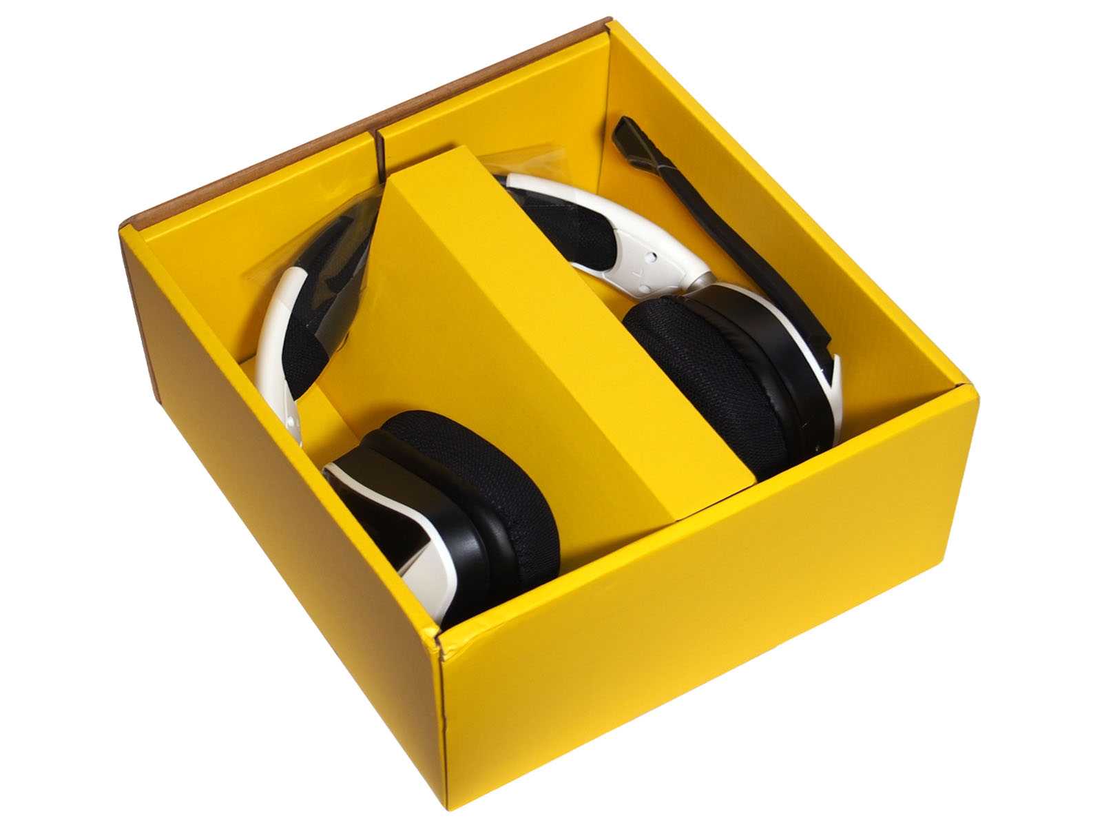Оригинальная коробка с гарнитурой по сути является двухслойной. Снаружи — тонкостенная картонная оболочка в фирменной жёлто-черной расцветке и с качественными изображениями устройства, а внутри ещё одна чисто жёлтая коробка из более плотного картона.