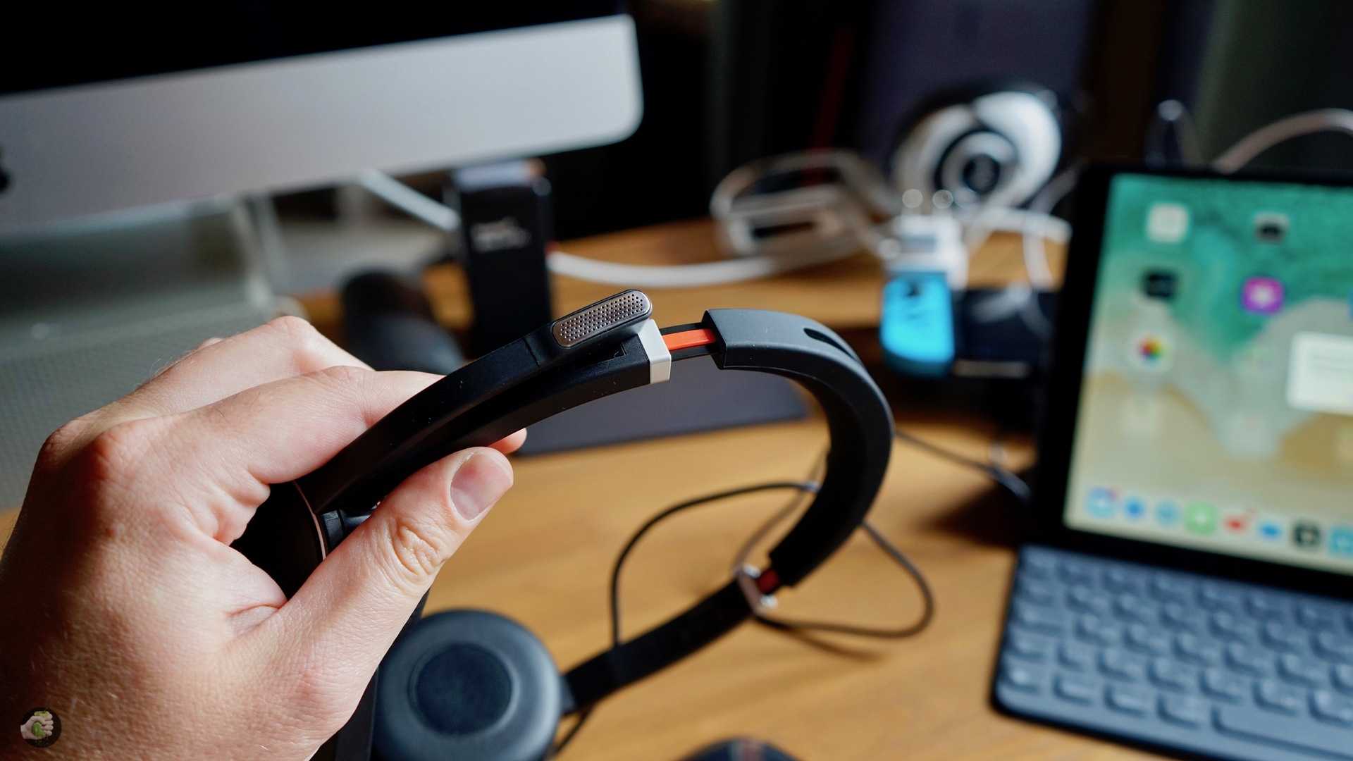 Так как это корпоративный продукт, то дизайн тут классический: пластик, круглые чашки, оголовье отделано резиной, никаких сенсоров, обычные кнопки. И это, естественно, большой плюс. Мелких приятных деталек хоть отбавляй: ножка микрофона складывается, на кончике металлическая плашка с перфорацией. А ещё ножка примагничивается к площадке на оголовье с характерным щелчком, очень круто сделано. И ещё про дужку: когда она примагничивается, звук отключается и наоборот.