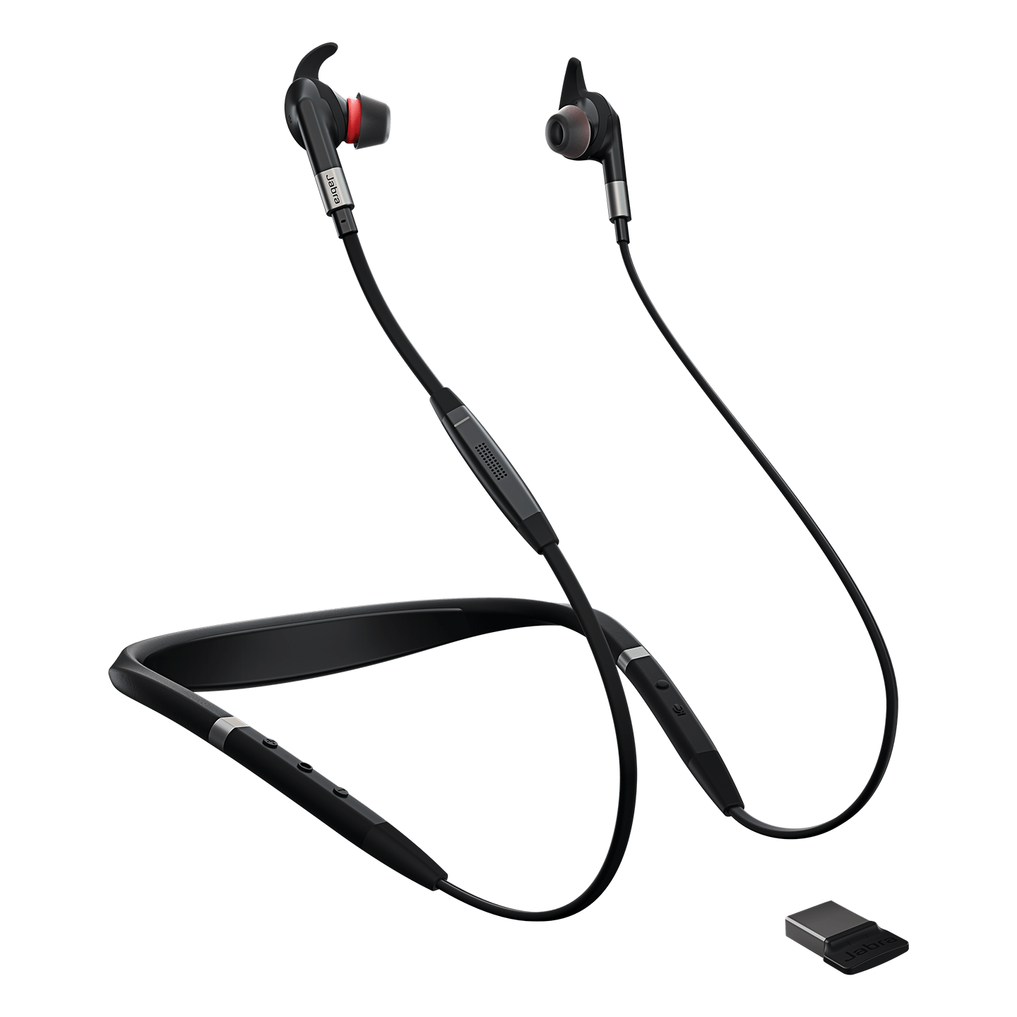 В комплекте есть USB-донгл Jabra Link 370 для подключения к компьютеру, можно одновременно использовать наушники с офисными программами и со своим телефоном, слушать музыку и принимать вызовы со всех подключённых устройств.