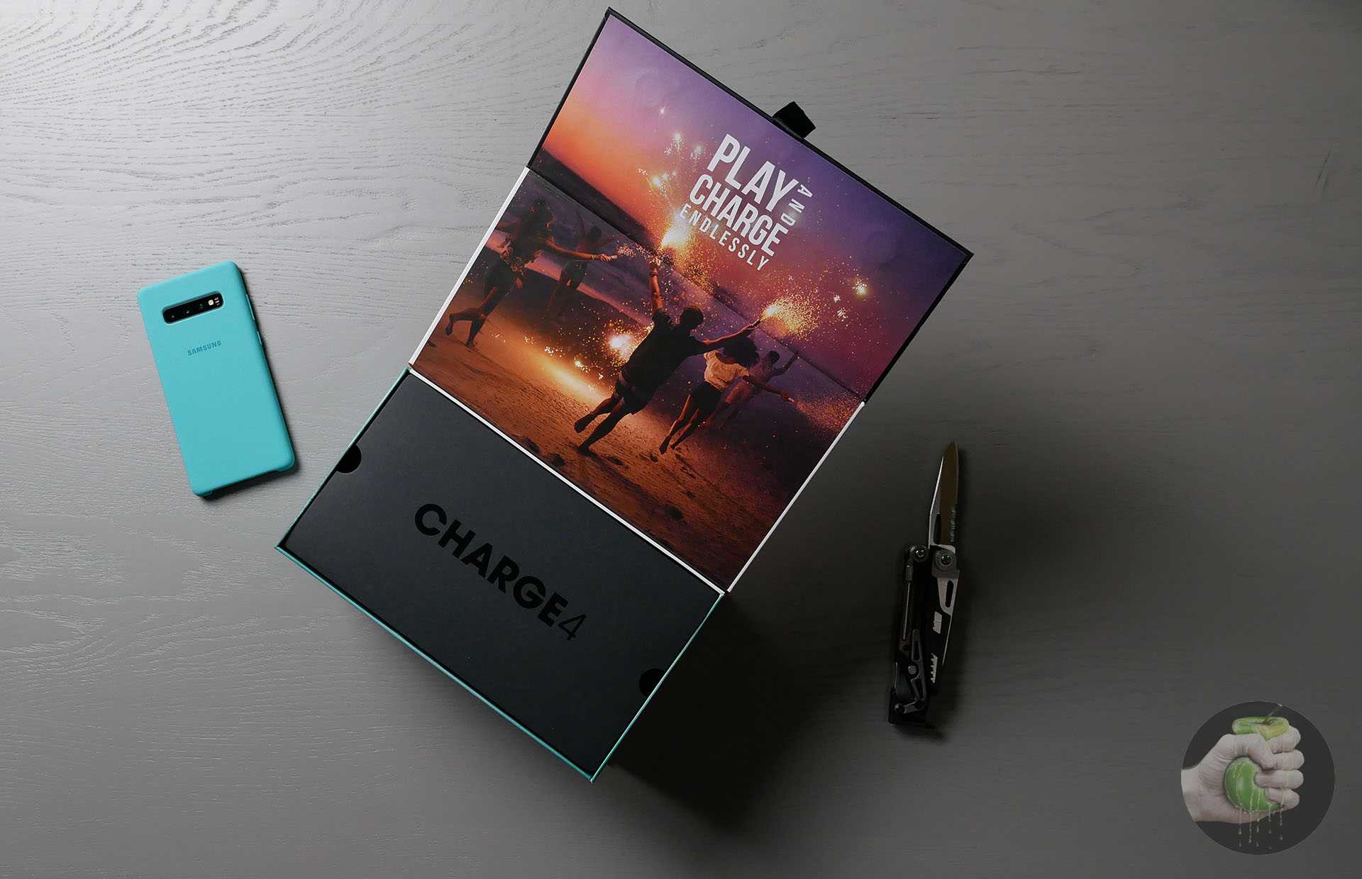 Тянешь язычок — и крышечка приподнимается. Тут перед тобой предстаёт глянцевая надпись Charge на матовой картонке. Поднимаешь её и видишь колонку. У нас она яркая, нежно-бирюзового цвета. Мне нравится.
