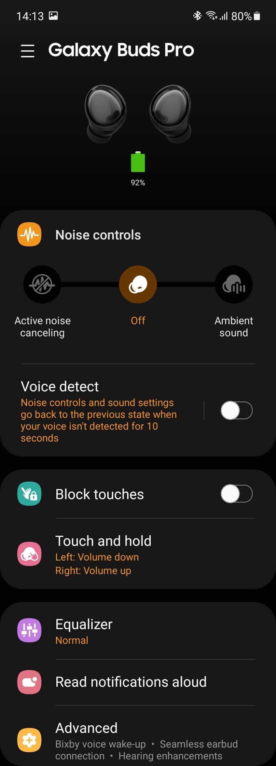 В любом случае, как мы рассказали в нашем Обзор Galaxy Buds Pro, у них довольно хороший ANC, которого вам должно хватить, когда играет музыка. Но он даже не так силен, как АНК на Например, AirPods Pro. На Buds Pro функция ANC блокирует низкочастотный шум, такой как грохот двигателя автобуса, но вы можете довольно хорошо слышать высокочастотные звуки, когда не играет музыка. С помощью приложения Galaxy Wearable вы также можете установить ANC на «Низкий» или «Высокий» или переключиться на окружающий звук.
