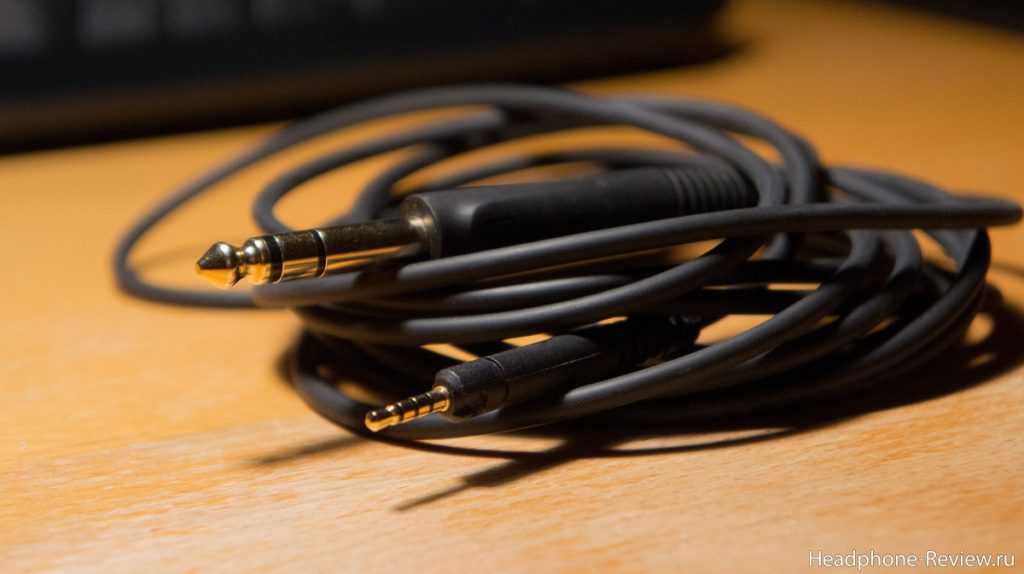 Толстый витой шнур позволяет избежать запутывания с другими проводами, что актуально для тех, кто имеет дело с большим количеством устройств. Его длина 1 м, но он может растягиваться вплоть до 3 м. Разъём наушников классический для портативной техники: 3,5 мм, но есть и переходник в комплекте для стационарной аппаратуры с разъёмом 6,3 мм. Резьба на разъёме будет препятствовать его случайному отсоединению.