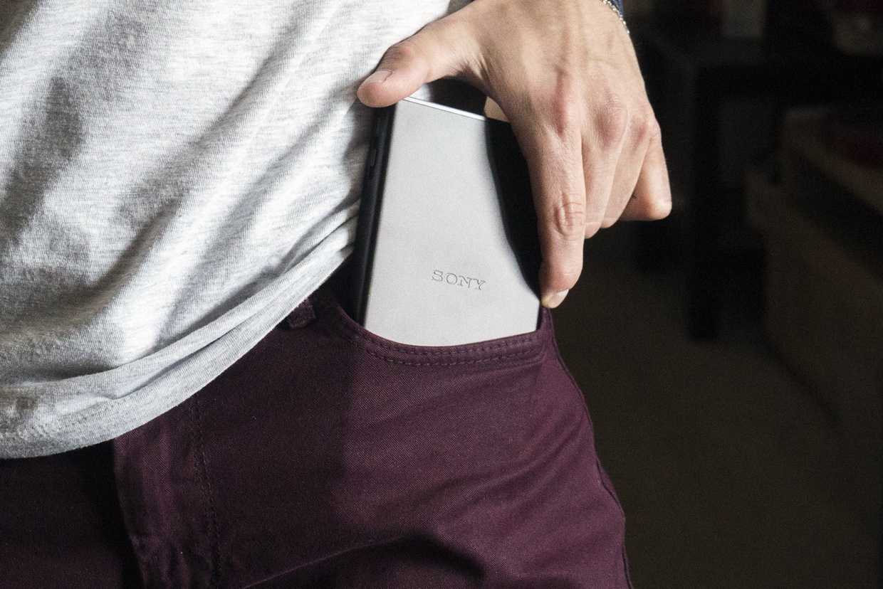 Модель весит всего 66 г и имеет размеры 109×43.6×8.7 мм, что впечатляет в мире огромных “портативных” смартфонов с 5,5” дисплеями. Фронтальная часть выполнена из алюминия с круговыми сечениями, а обратная из матового пластика. Устройство выглядит лаконично и стильно, да ‒ это Sony. В руке держать плеер приятно, хотя и необычно, все из-за минимальных размеров.