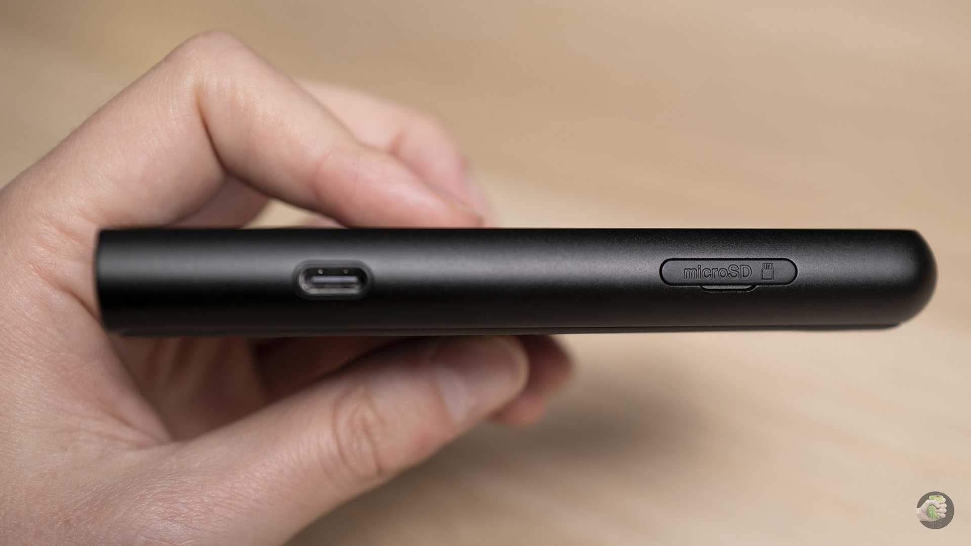 В коробке, помимо самого плеера, вы найдёте макулатуру, кабель USB Type-A с одной и Type-C с другой стороны. Именно порт Type-C находится на самом плеере.
