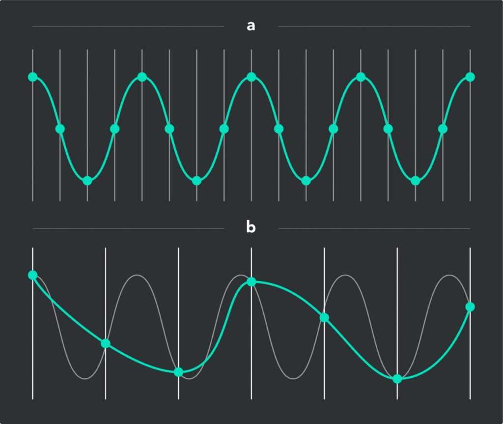 Любая частота дискретизации, которая превышает удвоенную частоту звука, будет полностью передавать его характеристики без искажения (рис. сверху). Искажения происходят только тогда, когда частота дискретизации падает ниже удвоенной частоты кодируемого звука (рис. внизу)