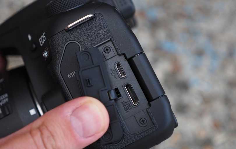 На левой грани под тремя резиновыми заглушками скрыты разъёмы подключения микрофона, наушников, USB- и HDMI-кабелей, а также проводного пульта дистанционного управления. На правой грани находится слот установки карты памяти формата SD (теперь с поддержкой UHS-II), прикрытый пластиковой крышкой.