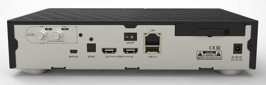 На тыльной стороне ресивера установлен выход сдвоенного тюнера Plug&Play-Twin-Sat, оптический выход аудио S/PDIF, HDMI порт к которому можно подключать внешние устройства, например, Blu-ray плеер. Там же находятся порты Gigabit LAN, один USB 3.0, Mini-USB для сервисного обслуживания и розетка для внешнего блока питания. В правом верхнем углу находится отсек для 2,5″ SATA жесткого диска. Стоит отметить, что выключатель питания отсутствует физически.