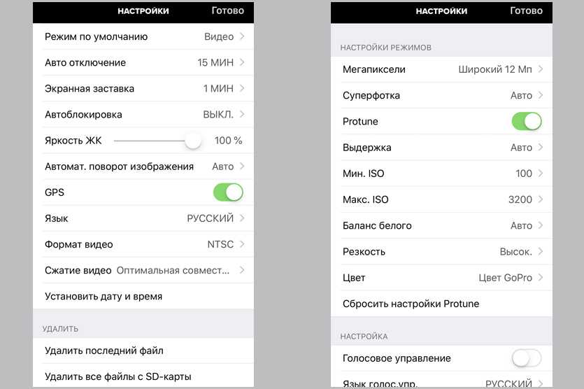 - видео (разрешение, количество кадров в секунду, угол обзора, активация режима замера экспозиции и фирменного «улучшайзера» Protune);