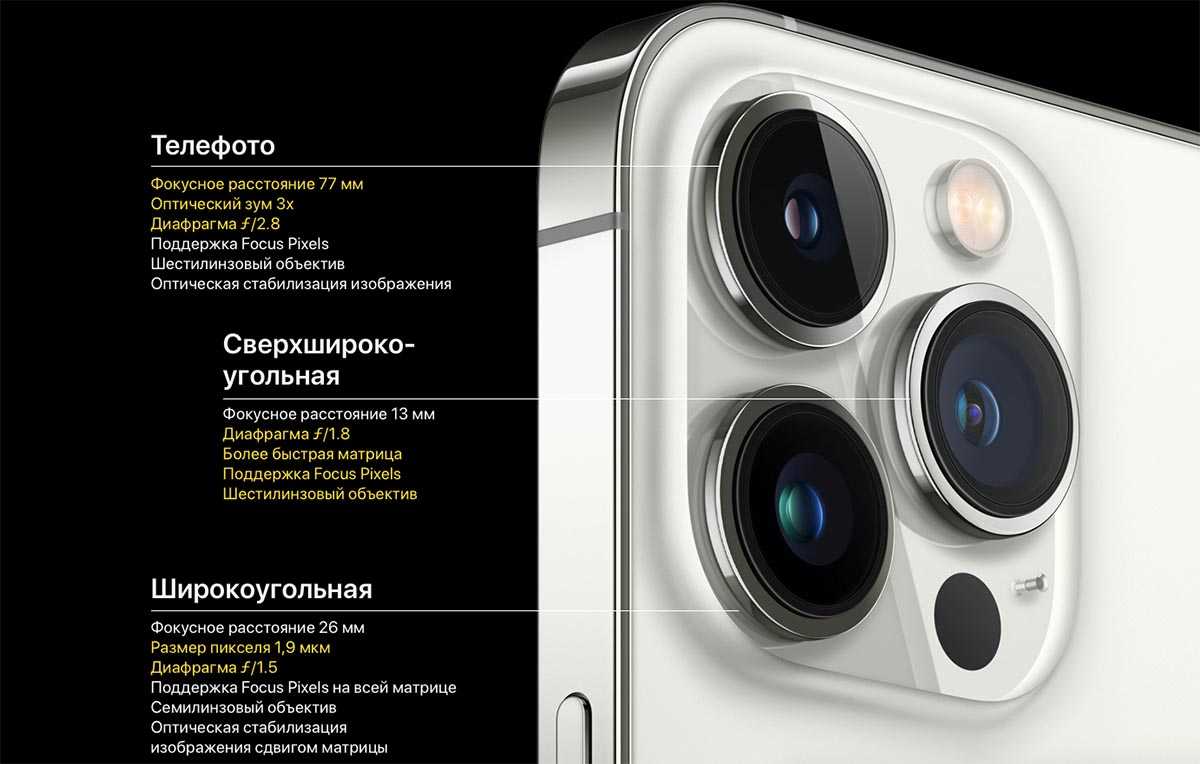 В iPhone 13 Pro камеры прокачали более существенно. Теперь модуль из трех 12-дюймовых матриц имеет такие показатели: “телевик” ƒ/2.8, “ширик” ƒ/1.5, “сверхширик” ƒ/1.8.