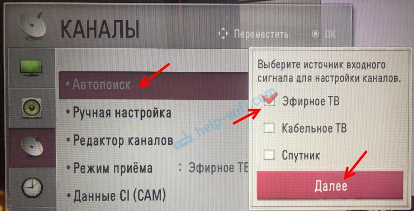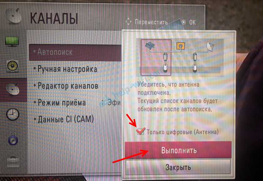 Поиск цифровых каналов нужно запустить в настройках телевизора. Конечно, в зависимости от самого телевизора (без Smart TV, с новой Smart TV системой (webOS) и старой) настройки могут отличаться. Но на всех телевизорах меню простое и понятное.