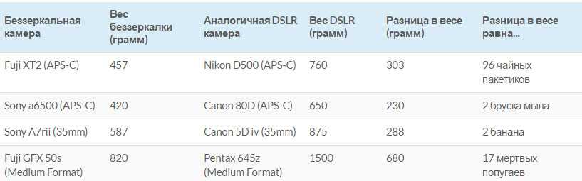 Вопреки тому, что вы можете подумать, разница в весе между беззеркальными и зеркальными камерами довольно мала. Конечно, Fuji XT2 НАМНОГО легче, чем старый Nikon D810, но это все из-за размера сенсора и, следовательно, веса объектива. Если рассматривать камеры с одинаковым размером сенсора, то разница в весе будет несколько сотен грамм.