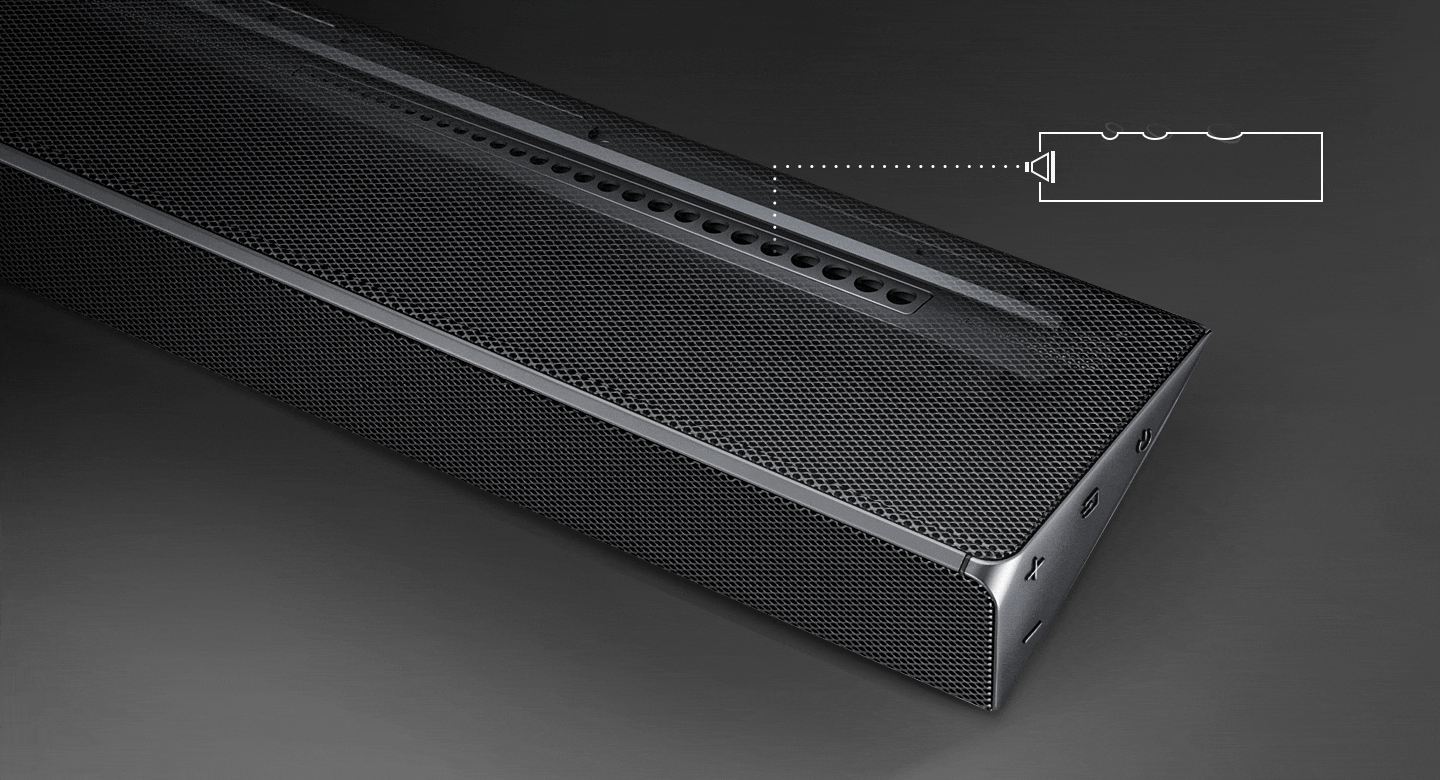 Конечно, о настоящем 5.1 здесь речи не идет: это скорее эмуляция. Но как плоской панели удается воспроизвести звучание из разных точек? Все просто (хотя и не очень). Во фронтальной части устройства расположены три динамика — саундбар достаточно длинный, чтобы крайние динамики воспринимались именно как левый и правый. В центре, соответственно, центральный. Еще два находятся в верхней части панели и работают в направлении «вверх-вбок».