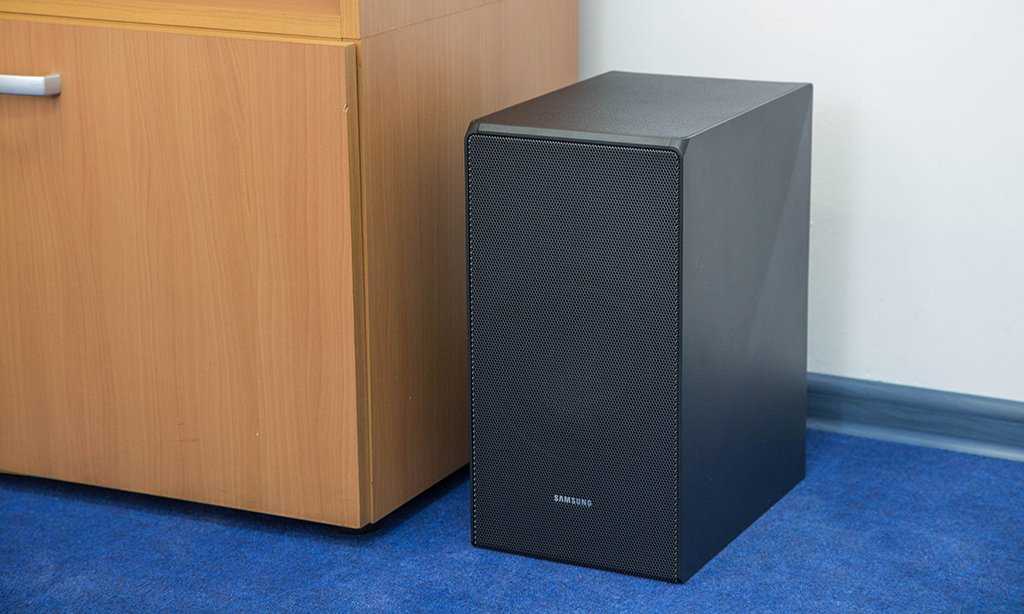 Сабвуфер Самсунг A450 имеет такой же размер, как и обычный корпус настольного ПК. Поскольку он подключается к бару по беспроводной сети, то его можно располагать в любом месте комнаты, только нужно предусмотреть розетку питания. Его габариты 18 х 34 х 27 см.