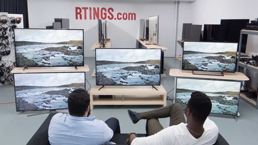 Top left: TCL P607 (55P607). Bottom left: Samsung MU6300 (UN55MU6300). Middle: Samsung MU6100 (UN58MU6100). Top right: Sony X720E (KD43X720E). Bottom right: LG UJ7700 (49UJ7700). Unlike our other photographs, this picture wasn’t taken under a controlled environment, so do not draw conclusions from it.