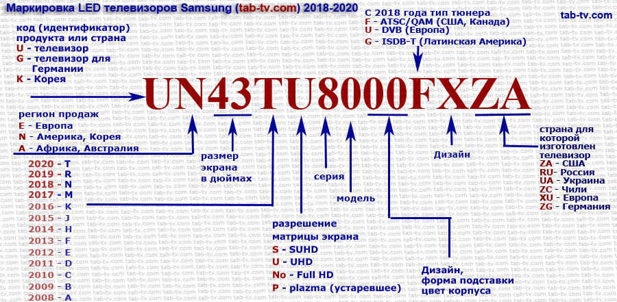 Начиная с 2008 года для данной продукции применяется единая система маркировки ТВ, которая действует и сегодня. Но стоит заметить, что номера классических моделей несколько отличаются от маркировки Самсунгов с QLED-экранами.