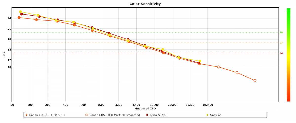 The Sony A1 has a very strong response for color sensitivity, especially at low ISOs, up to ISO 200, where it peaks at 25.9 bits at ISO 50/ISO 100 (overlaid on the graph), compared with the maximum 25.2 bits recorded by the Leica SL2-S. There’s also slight bump of around 0.5 bit between ISO 12,800 and ISO 25,600, though otherwise there isn’t much between them, which is pretty remarkable given the difference in pixel count.