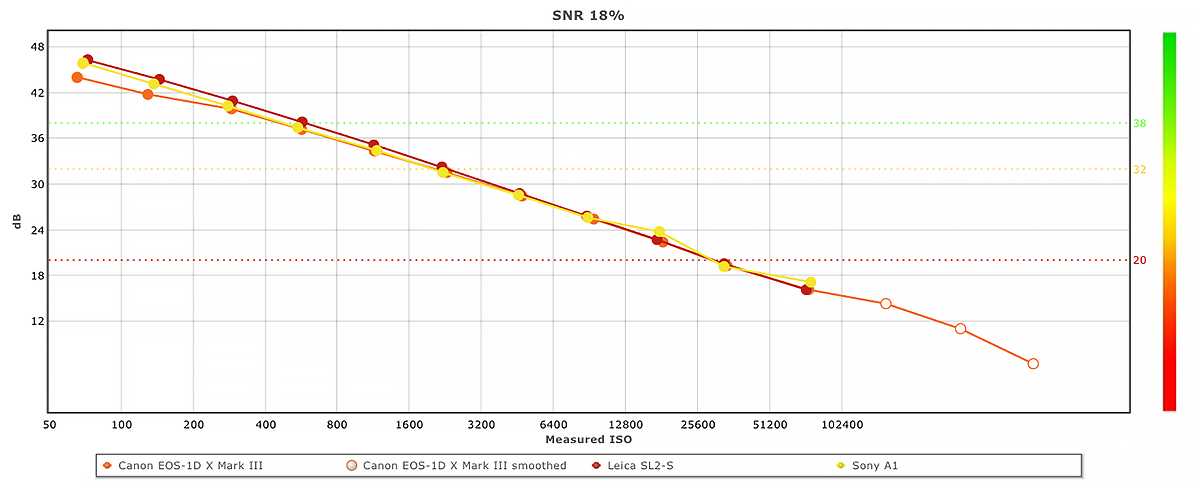 Given the Sony A1’s much higher pixel count, it isn’t really surprising to see slightly noisier images reflected in the Sony’s Sports score. However, what is perhaps surprising is that at low ISOs, the Sony is cleaner than the Canon and only marginally noisier than the Leica. At higher ISOs, the differences between the results reduce as the ISO sensitivity increases, with the Sony A1 only slightly noisier than both at our 30 dB quality threshold. That said, the +0.15EV difference between the Leica SL2-S (3163 ISO vs 3504 ISO) is barely noticeable, and it’s negligible when compared to the Canon EOS-1DX Mark III (3163 ISO vs 3248 ISO). At least that’s the case when output is normalized to 8 MP (equivalent to a 12×8 inch print at 300 dpi); when viewed on-screen, the difference in noise levels is more apparent.