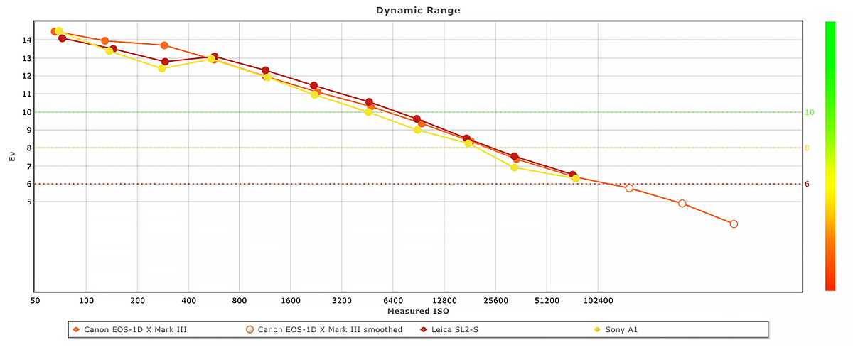 Although the Sony A1 beats the Leica SL2-S, the conventional FSI CMOS in the Canon EOS-1DX Mark III has the same 14.5 EV dynamic range at base, and the Canon trumps both rivals up to ISO 800. After that point, though, a gain in the response of the Sony and Leica put them both on a similar trajectory as the Canon, with the DR diminishing by around -1 EV per whole ISO step — up to ISO 102,400, anyway (although the Canon can go higher).