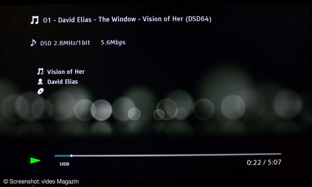Bei Musikwiedergabe von CD, DLNA oder USB zeigt der Sony Infos zu Titel, Interpreten und Formaten an, aber keine Albumcover. Screenshot: video Magazin