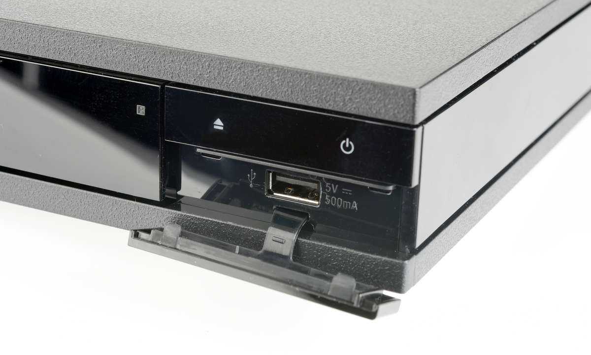 Für die schnelle Medienwiedergabe besitzt der Sony UBP-X800M2 eine USB-Buchse auf der Frontplatte. Ohne angeschlossenen Speicher ist die Buchse verdeckt. Sony