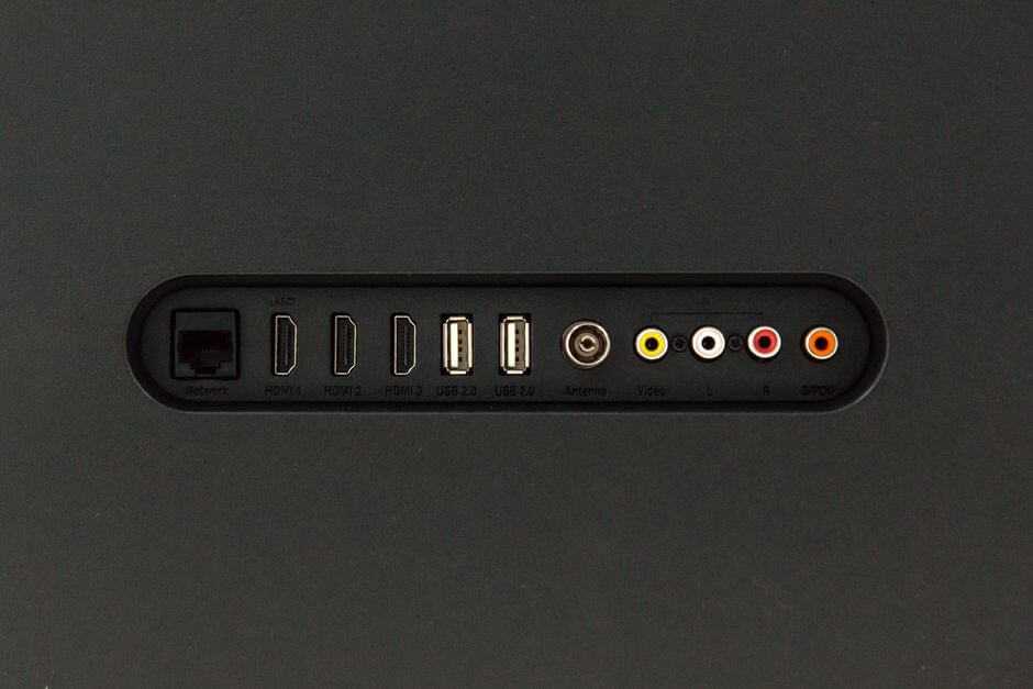 Все порты в телевизоре спрятали сзади. Это удобно по навигации – искать по сторонам не придется. Итак, что тут у нас – порт для проводного интернета, два порта HDMI 2.0 (в том числе ARC), два порта USB 2.0, AV DTMI и аудиовыход.