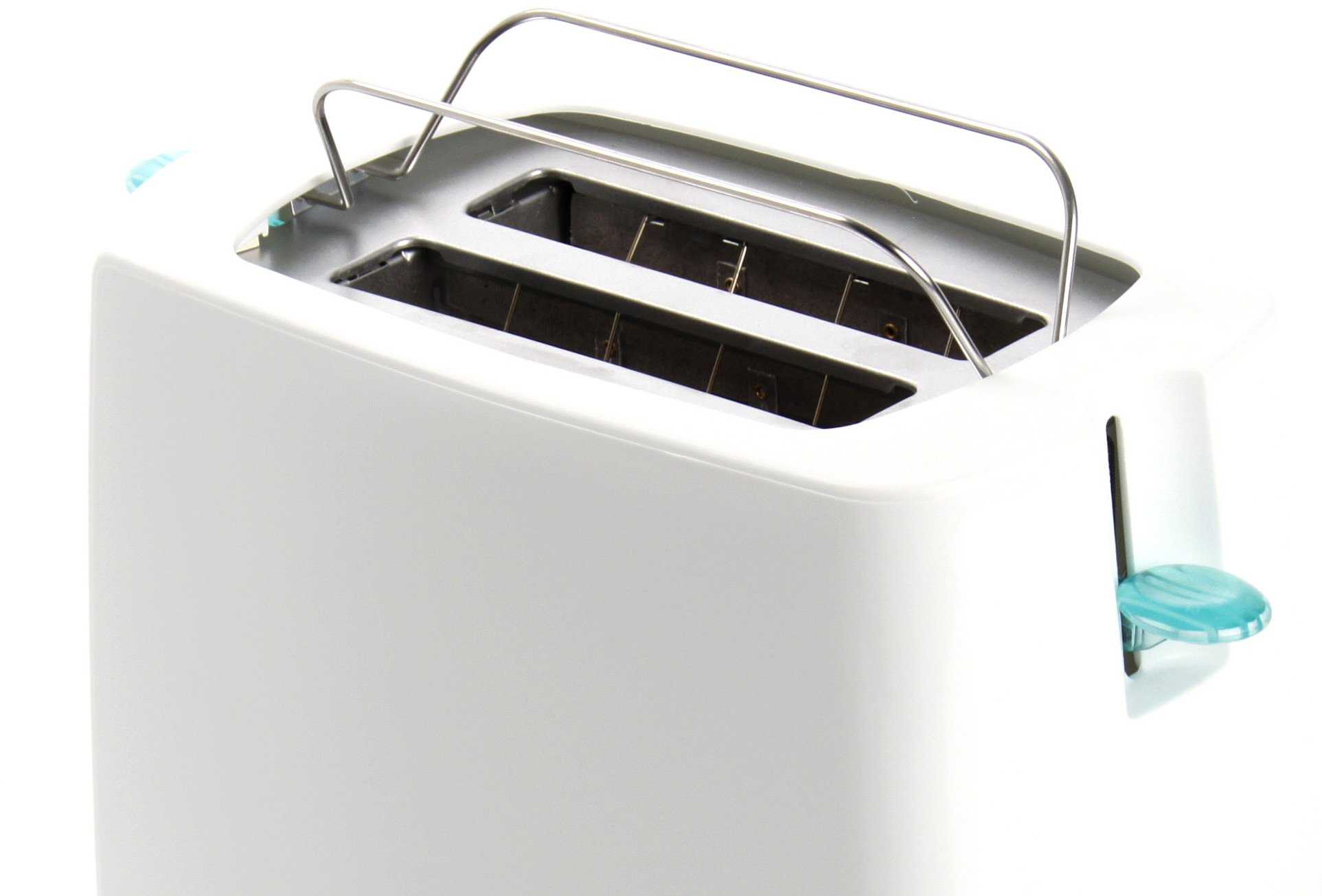 Компактное устройство из термостойкого пластика, белый цвет отлично впишется в любой интерьер кухни. Прибор гарантирует поджарку двух тостов. Дополнительно производитель позаботился о возможности подогреть булочку, круассан с помощью решётки. За такую функциональность потребуется заплатить немного.