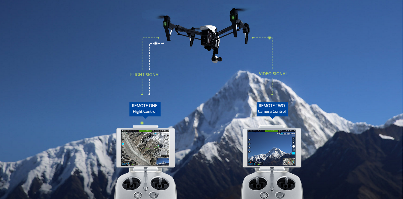DJI Inspire 1 может работать сразу с двумя пультами ДУ, один из которых синхронизируется с самим летательным аппаратом, а другой позволяет управлять камерой. Для удобства пользователя картинка отображается на двух планшетах. Такое решение обязательно понравится профессионалам, привыкшим решать несколько рабочих задач одновременно. Единственное неудобство заключается в том, что второй пульт придется покупать отдельно, так как комплектацией он не предусмотрен