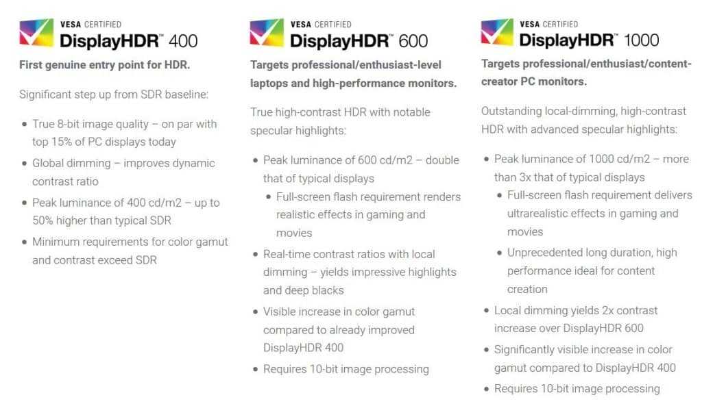 Чтобы различать мониторы HDR10, обратите внимание на сертификацию VESA DisplayHDR. Большинство людей считают, что для оптимального или «истинного» просмотра HDR дисплей должен иметь пиковую яркость не менее 1000 нит