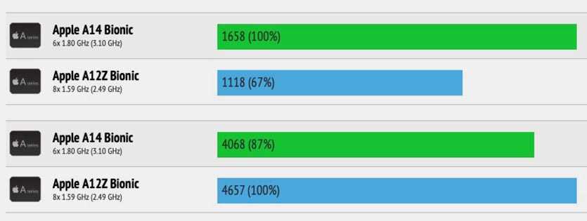 Процессор iPad Air уверенно побеждает в одноядерном тесте производительности, но при этом не учитывается многопоточность и влияние быстрой оперативной памяти на скорость обработки информации. Другими словами, подобные задачи перед планшетами во время эксплуатации практически не возникают.
