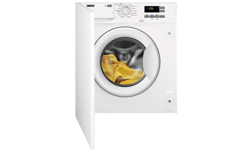 Компактная встраиваемая модель стиральной машины с объемным бараном, в который можно загрузить даже такие вещи, как подушки и одеяло.