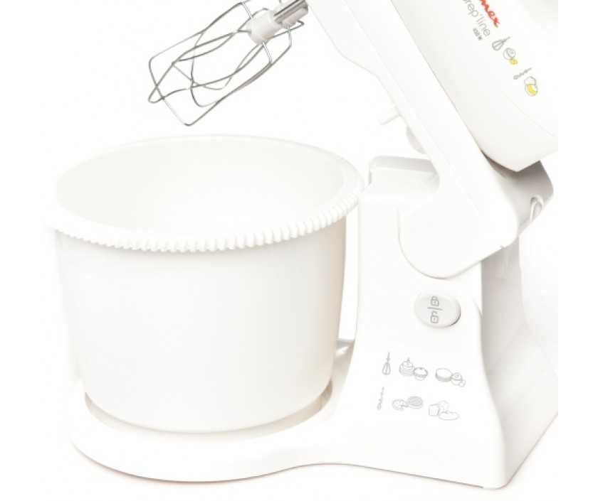 Данная модель планетарного миксера является самым бюджетным вариантом в соотношении «цена–качество». Обладая мощностью в 450 Вт, Moulinex HM 4121 имеет пять скоростей для выполнения любых задач. Чаша – 2,5 литра, пластиковая. Крюк и венчик – из нержавеющей стали.